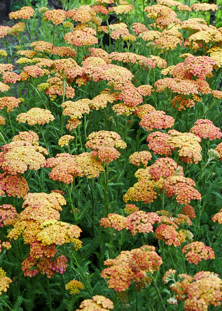 Virág: 5-10 cm átmérőjű lapos, sátorozó virágzatait apró fészekvirágzatok alkotják, júniustól szeptemberig nyílnak, ezalatt a sárga – narancssárgától-baracksárgástól a szalmaszínig terjedő -megannyi árnyalatával virágzik. .A beporzó rovarok körében is nagyon népszerű, így nemcsak meleg színeket, de kellemes zümmögést is „hoz” a kertbe.