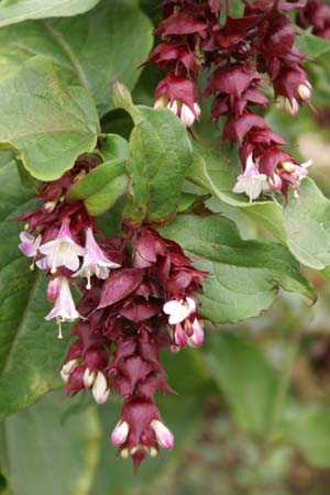 Virág: Júniustól szeptemberig folyamatosan hozza 3-10 cm-es csüngő füzérekben, lilásvörös fellevelekkel körülvett, harang alakú, fehér virágait. Később a virágokat a fellevelek között gömbölyű, fényes, sötétlila, szinte fekete bogyók követik, melyek a zöld hajtásokon egész télen díszítenek, de a madarak is szívesen fogyasztják őket.