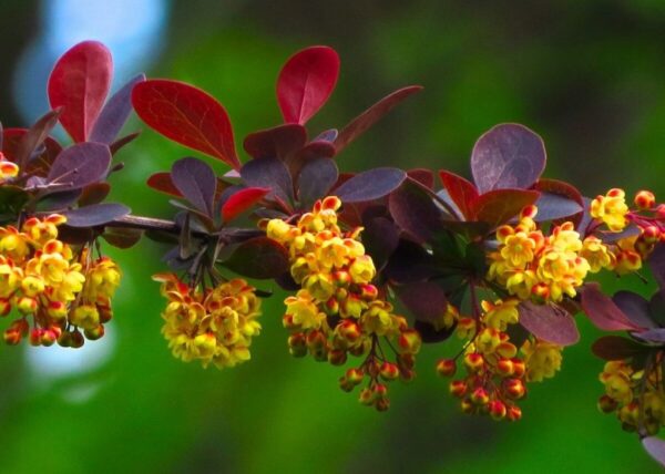 Habitus: Kistermetű kb 80-100 cm , gömbölyded, sűrű hajtásrendszert nevelő lombhullató, cserje. Levelei kerekdedek , széles lándzsa alakúak, zöldes bordó színűek, melyek ősszel élénk vörös színűre változnak.