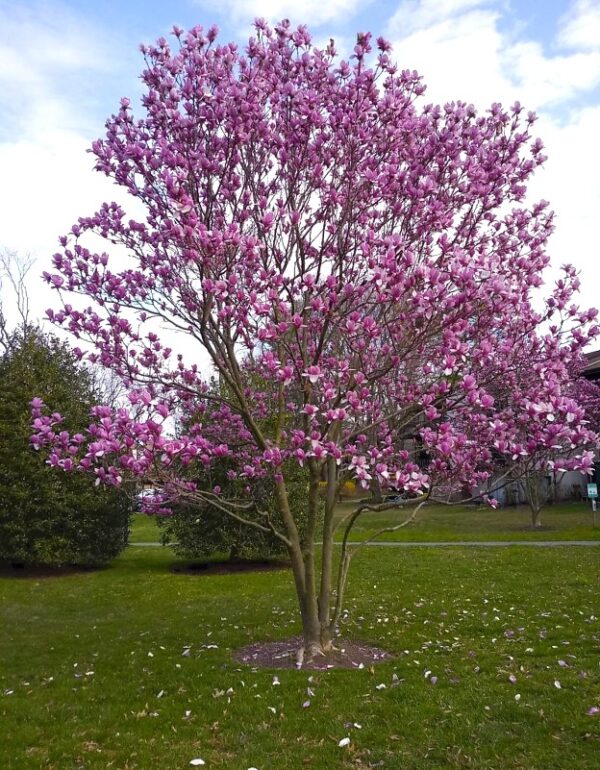 Virág: igen nagyméretű (15-20 cm), kehely alakú, gazdag vöröseslila, belül fehéres rózsaszín, kellemes illatú virágait április-májusban, lombfakadás előtt gazdagon bontja.